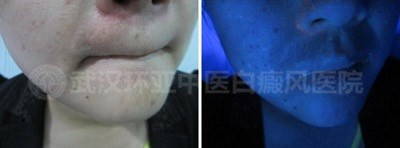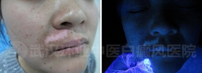 现病史:患者3年前无明显诱因面部出现白斑,并逐渐增大,近期扩散加剧,无其他自觉症状。曾在其他医院给予口服及外用药,效果不佳。